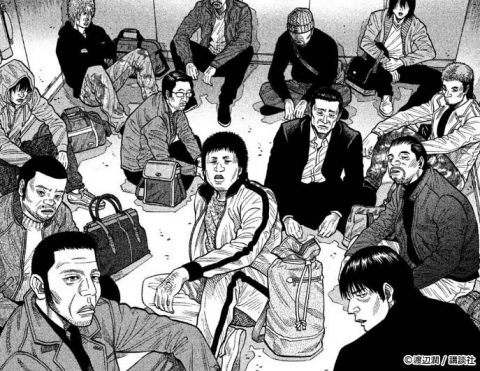 ここで3ヶ月働けば借金が帳消しになるという、なんとも美味しい条件ですが、ちょっと不穏な雰囲気…。仕事の依頼主らしき男の話を聞いて、しばし船内で談笑をする作業員たち。しかし矢口がトイレに立ち寄った瞬間に異変が…!