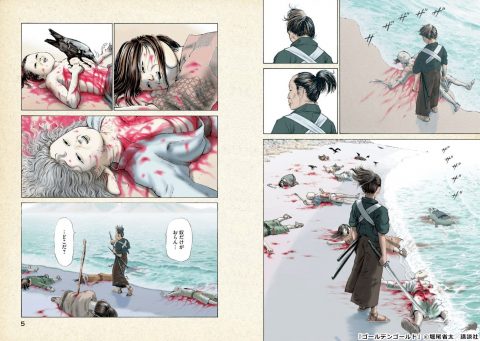 数多くの屍が血まみれで波打ち際に横たわりカラスに啄まれています。
