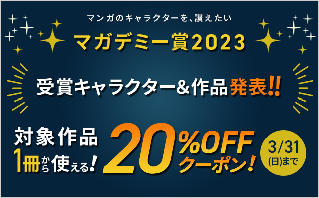 マガデミー賞2023 の受賞キャラクター・受賞作品および、ノミネートキャラクターが登場するマンガ全作品・作品賞ノミネート作品がお得に購⼊できるキャンペーンを、総合電⼦書籍ストア「ブックライブ」で実施中!