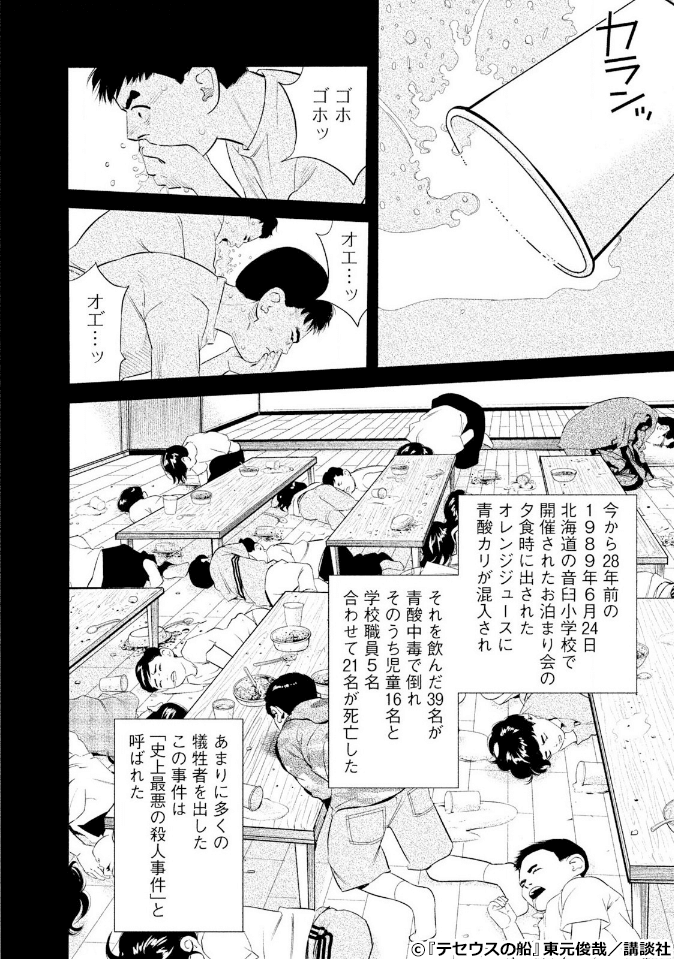 1989年6月24日。小学校のお泊まり会で、夕食時に出されたオレンジジュースに何者かが青酸カリを混入。それによって39名が青酸中毒で倒れ、そのうち児童16名と学校職員5名の合わせて21名が死亡するという陰惨な事件が起こります。