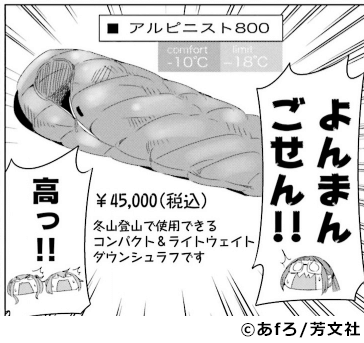 作中の名称と同名のシュラフがNANGAというメーカーから販売されていましたが、スペックと価格からモンベルではないかという意見が多いです。