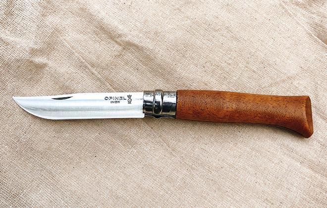 大きさがわかりにくいですが、写真は#8サイズ。ハンドル材がクルミのものです。一般的なモデルはブナ材にOPINELのプリントが施されています。