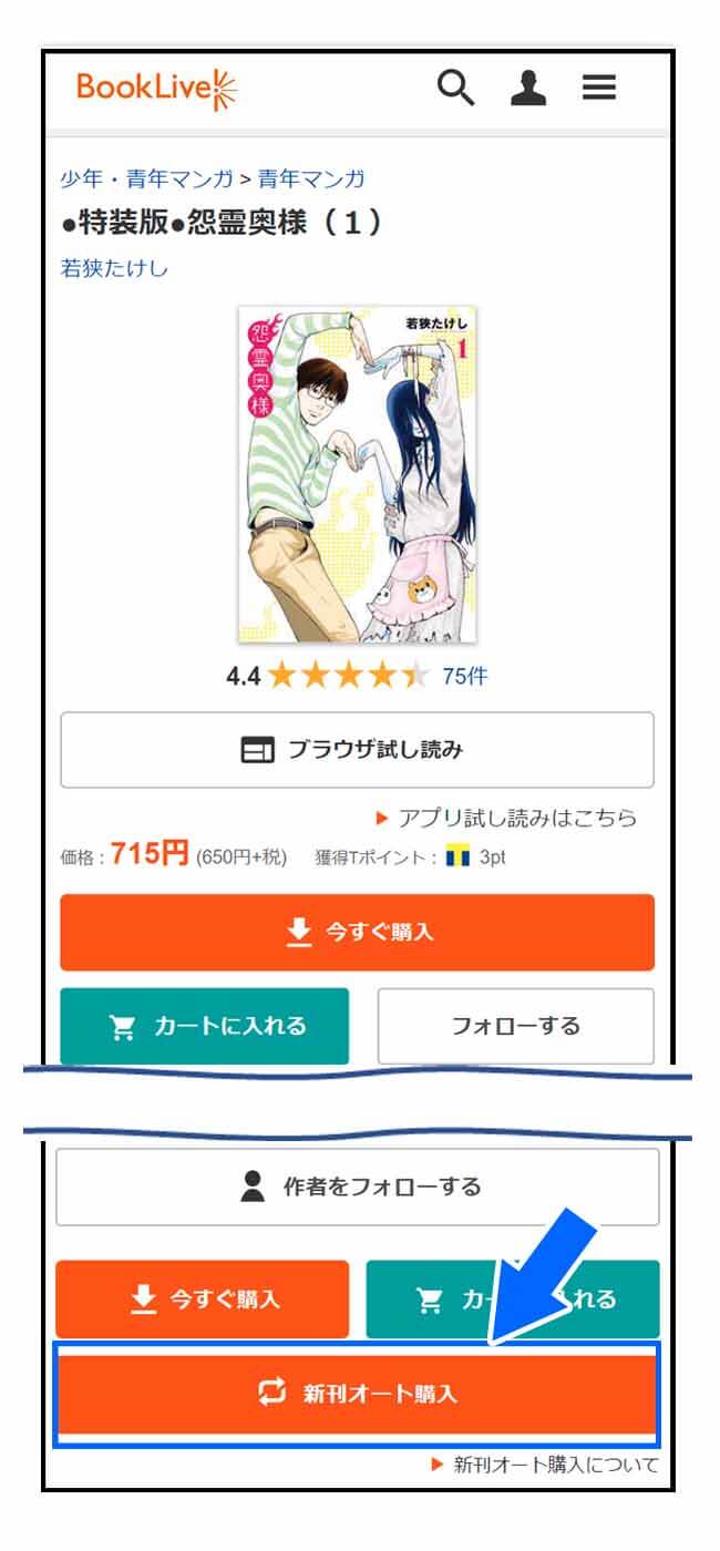 ※画像は作品詳細ページにおける、新刊オート購入ボタンの位置を表示しています。