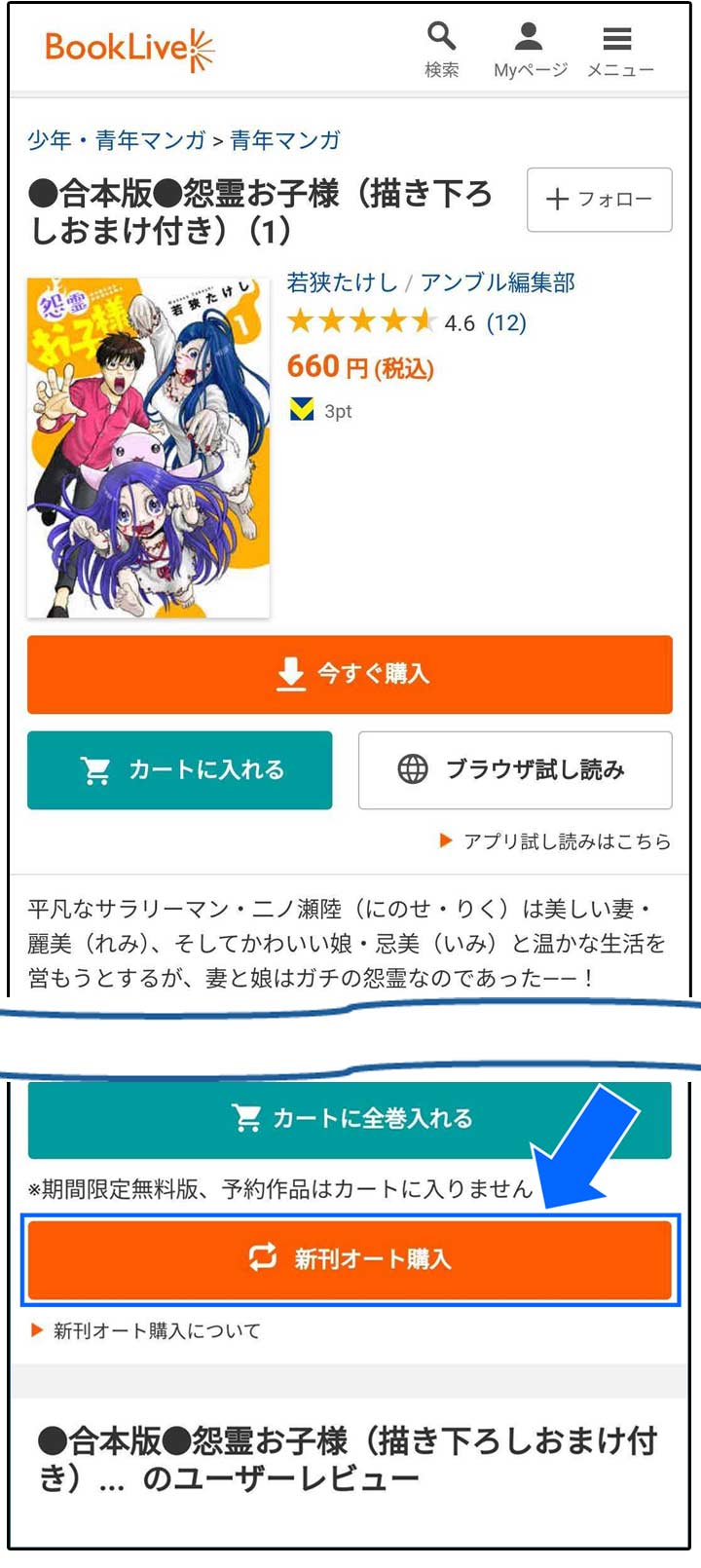 ※画像は作品詳細ページにおける、新刊オート購入ボタンの位置を表示しています。