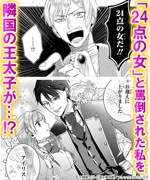 甘え下手なマジメ令嬢×一途な隣国の王太子、契約結婚から始まる焦れキュン・ロマンティックラブ!貴族の令嬢・アイリスは、婚約者である王子・ロイドから「お前は24点の女だ!」と赤点をつけられ、婚約破棄を告げられる。驚きを隠せないアイリスだったが、そんな彼女の前に「孤高の王子」と呼ばれる隣国の第一王子・レノが現れ、突然求婚されちゃって――!? (C)味田マヨ (C)清水幸詩郎/フレックスコミックス