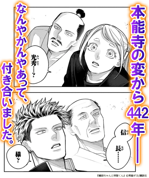 本能寺の変から442年ーーなんやかんやあって、付き合いました。 学園一の不良・明智隆之介と、学園のアイドル・織田麻里亜。想い合う二人の前世は、かつて裏切り裏切られた明智光秀(と織田信長だった! 記憶が戻ったことで、再び明智を支配下においた織田は、カップルを装いつつ現世での天下統一を目指すことに…!? JK信長×ヤンキー光秀! 愛憎入り混じる学園生活、開幕ッ!