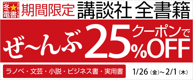 「冬☆電書2018」特別企画第2弾! 期間限定!講談社全書籍25%OFFクーポン開催中!講談社のラノベ・文芸・小説・ビジネス書・実用書がクーポンで何冊でも25%OFF!【1/26(金)~2/1(木)】 ※セーフサーチを中またはOFFにすると、すべての作品が表示されます。