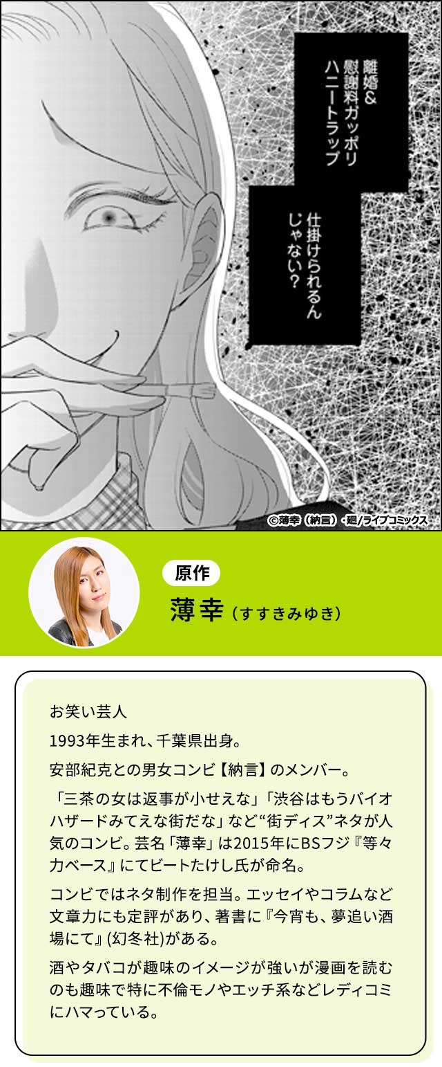 「あんな甘ったるいだけのつまんない男と、結婚なんてしなきゃよかった!!」 夫・瑛太(えいた)との結婚生活に飽き飽きしているBA(美容部員)のすみれ。 どうにかして瑛太と別れ、不倫相手の翔(しょう)と一緒になれないものかと考えていた矢先、職場に高校時代のバイトの後輩・芽衣(めい)が現れる。 メイクを施すと、瑛太の“推し”の女優と瓜二つに化けた芽衣を見たすみれに、悪魔がそっと囁いた。 「この子を使って瑛太にハニートラップをしかけたら、慰謝料ガッポリもらって離婚できるんじゃない……?」 テレビ朝日の漫画バラエティ番組「バズマンTV」発! お笑い芸人・薄幸(納言)と『虐げられ令嬢とケガレ公爵~そのケガレ、払ってみせます!~』の廻がタッグを組んで贈る、つまらない夫を捨てたい自己中女の不倫捏造ドロ沼ストーリー!