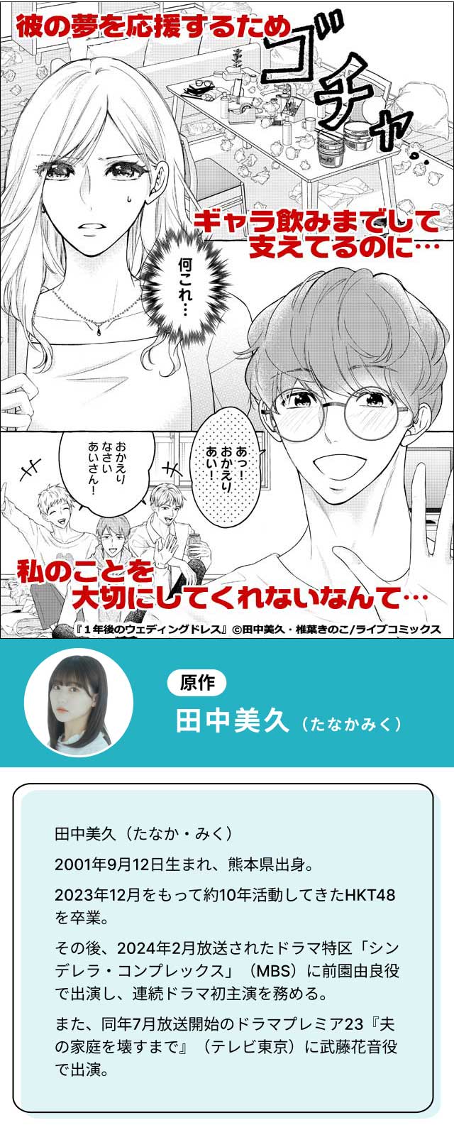 ★特装版限定 椎葉きのこ先生収録レポ漫画&原作者・田中美久さんQ&Aインタビュー収録!★ 「愛さえあれば、なんでも乗り越えられると思ってた」 売れないお笑い芸人の彼氏・健(たける)と同棲中のあいは、 「30歳までには結婚する」という約束を心の支えに、献身的に彼の夢を応援している。 下積み中の健のために"ギャラ飲み"までして支えているにもかかわらず、 健は毎日遊んでばかりでお金にもだらしない。 30歳を目前に、そんな不安定な生活に嫌気がさし始めていた矢先、 あいはIT企業の社長・慎(しん)と出会う。 お金持ちで紳士的な慎との出会いによって、あいの運命が大きく変わり始め――。 テレビ朝日の漫画バラエティ番組「バズマンTV」発! 女優・田中美久と漫画家・椎葉きのこがタッグを組んで贈る、 結婚したいアラサー女子が《愛》と《お金》の間で揺れるトライアングルラブ! 【特典内容】 ・椎葉きのこ先生収録レポ漫画(1) ・原作者・田中美久さんQ&Aインタビュー(1) 【本作品は「1年後のウェディングドレス」第1話~第6話を収録したものです】