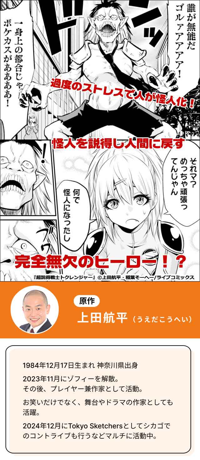 20XX年、日本の都市部において人が怪人に突如変異し、暴れまわるという事件が多発していた。その原因は解明されていなかったが、過度のストレスが関係していると推測されている。 異形となり無差別に暴れまわる怪人。そんな彼らを元の姿に戻す方法はただ一つ、それは「説得」である。 正論・ロジカル・ギャル・エモさ・ハグを駆使して怪人を説得し、人間の姿に戻そうと奮闘するニュータイプヒーロー『超説得戦士トクレンジャー』の戦いの歴史が幕を開ける―― テレビ朝日の漫画バラエティ番組「バズマンTV」発! 芸人・上田航平と漫画家・稲葉そーへーがタッグを組んだ超説得バトルコメディ『説得戦隊トクレンジャー!』の連載化作品です。