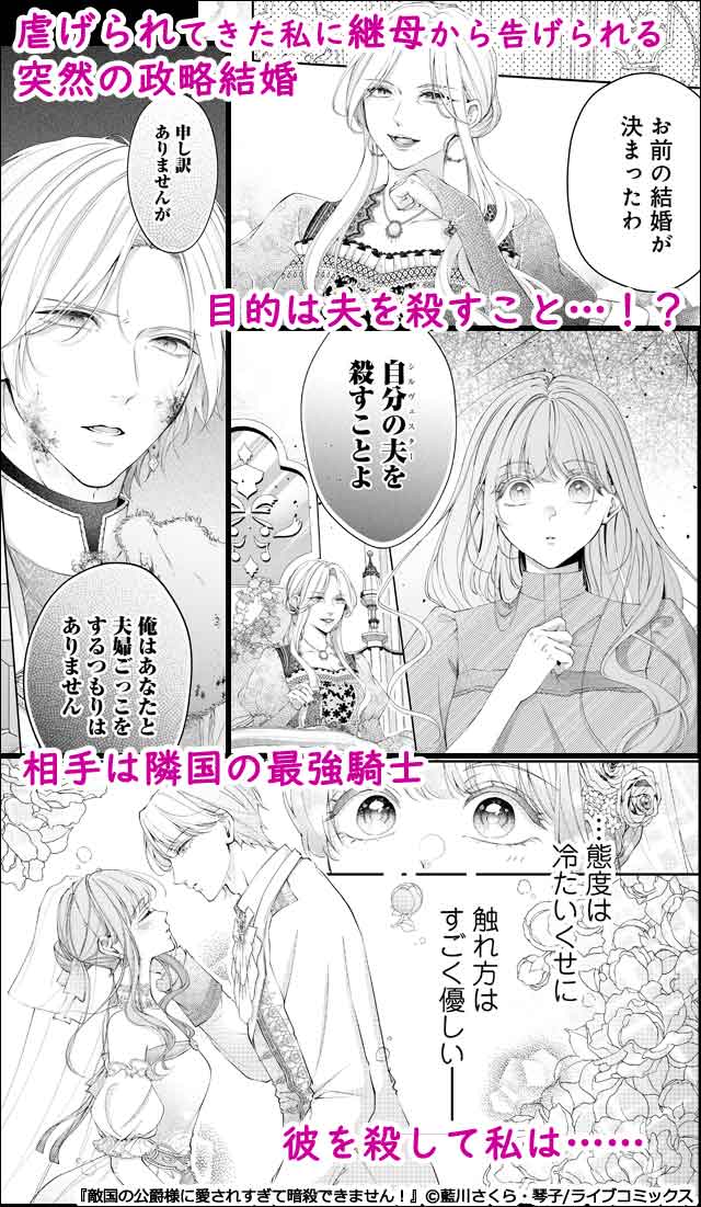 「俺はあなたと夫婦ごっこをするつもりはありません」こんな美形を誘惑しろなんて…嘘でしょう!? ウィレット王国の第二王女レティシアは、義母や義姉に虐げられる日々を過ごしていた。そんなある日、義母から突如隣国最強の騎士・シルヴェスター公爵の暗殺を命じられる。病床にある実の妹を人質に取られたレティシアは、言われるがまま公爵と結婚し、誘惑して近づくことに。 だが、いざ対面した公爵様は強烈な美形。そのうえレティシアに冷たい態度…。けれどそんなことでめげてはいられない。妹のために、どんな手を使っても籠絡してやるんだから…! 「一度だけでも、抱いてくれませんか?」新婚初夜にそう迫れば、公爵が見せたのは意外な反応で…? テレビ朝日の漫画バラエティ番組「バズマンTV」発! 人気作家・琴子と漫画家・藍川さくらが贈る、 クールな最強騎士公爵と虐げられ王女の、キケンで甘い政略結婚から始まる異世界ラブストーリー。