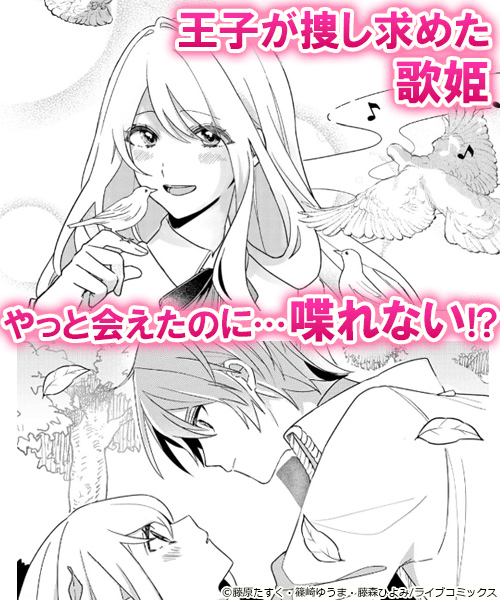 「あなたの歌声に、この心を奪われてしまったから!」 両親の営む小さな酒場で働くフィアノは、歌うことが大好き。 その美しい声と明るい性格で男たちに言い寄られることも多いが、今の生活でじゅうぶん幸せだからと恋愛に興味が持てずにいた。 そんなある日、フィアノは第一王子・アレクス主催の園歌会に参加することに。 来てくれた皆様に、精一杯歌を届けましょう――って、声が出ない!? 声を奪われた歌姫と恋を知らない冷淡王子の、歌声が結ぶピュアラブストーリー。
