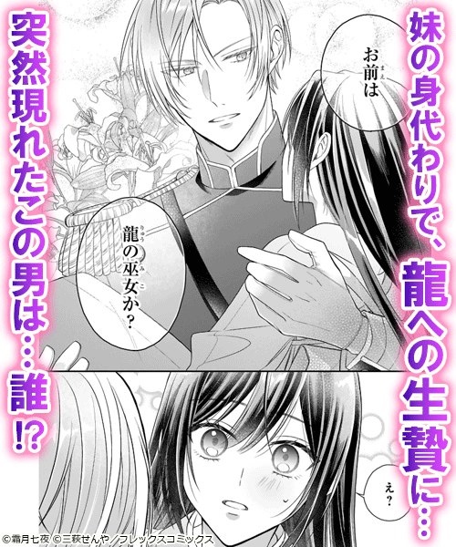 「やっと見つけた、俺の最愛――」 瑞ノ江家の令嬢・千代は妹と比べられ、虐げられる日々。ついには生贄として龍に捧げられてしまう。死を覚悟した千代だったが、突如現れた美しい男に救われ、さらには彼の妻として迎えられることになって!? すべてをあきらめた少女が孤高の総司令官に見初められ花開く、運命の溺愛ファンタジー! (C)霜月七夜 (C)三萩せんや/フレックスコミックス