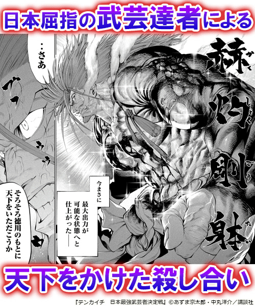 日ノ本最強の武芸者は誰か!? これは我々の知る歴史ではない。 時は西暦1600年。“織田信長”が天下統一してから10年が経過していた。信長は自分の死期を悟ると、最強の武芸者を輩出したものに“この国”を譲ると発表。天下統一の夢破れた武将たちは、それぞれ最強の武芸者を擁立し、この国の王を目指す! 第一試合は“天下無双槍”本多忠勝(後援:徳川家康)VS.“進化する天稟”宮本武蔵(後援:長宗我部元親)!! 誰もが夢見た異種武術時代絵巻、堂々開幕!!!!!!!