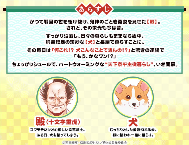 アニメ化決定!! 時は江戸。貧乏長屋暮らしを送る没落武士・殿(との)は、妙にむちりとした胴長短足の犬と出会う。小さな家臣ができた殿だけど、犬の自由奔放さにふりまわされてほだされて……!? 心優しき【殿】と気ままでほがらかな【犬】の、天下泰平主従ライフ!