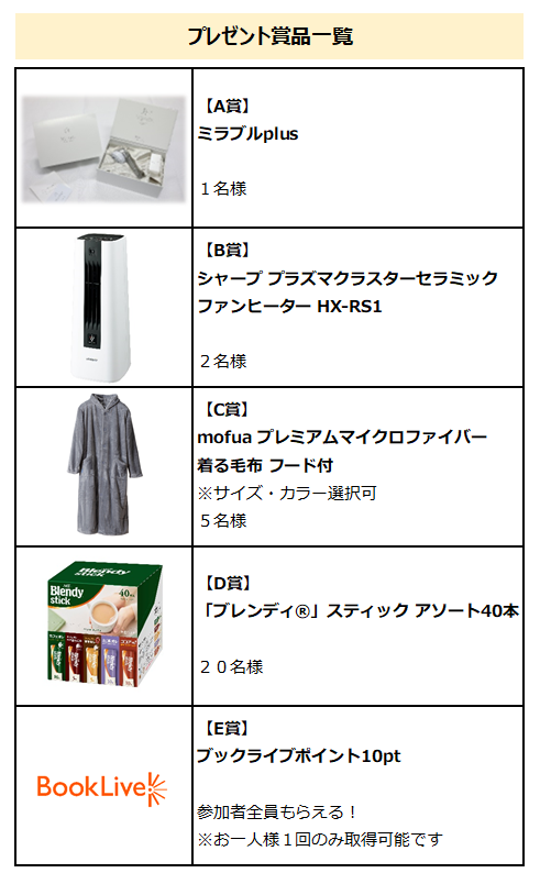 | プレゼント内容 | A賞 ミラブルplus×1名様 B賞 シャーププラズマクラスターセラミックファンヒーターHX-RS1×2名様 C賞 mofua プレミアムマイクロファイバー着る毛布 フード付×5名様 D賞 「ブレンディ®」スティック アソート40本×20名様 E賞 ブックライブポイント10pt 参加者全員(1アカウントにつき1回のみ取得可能) |