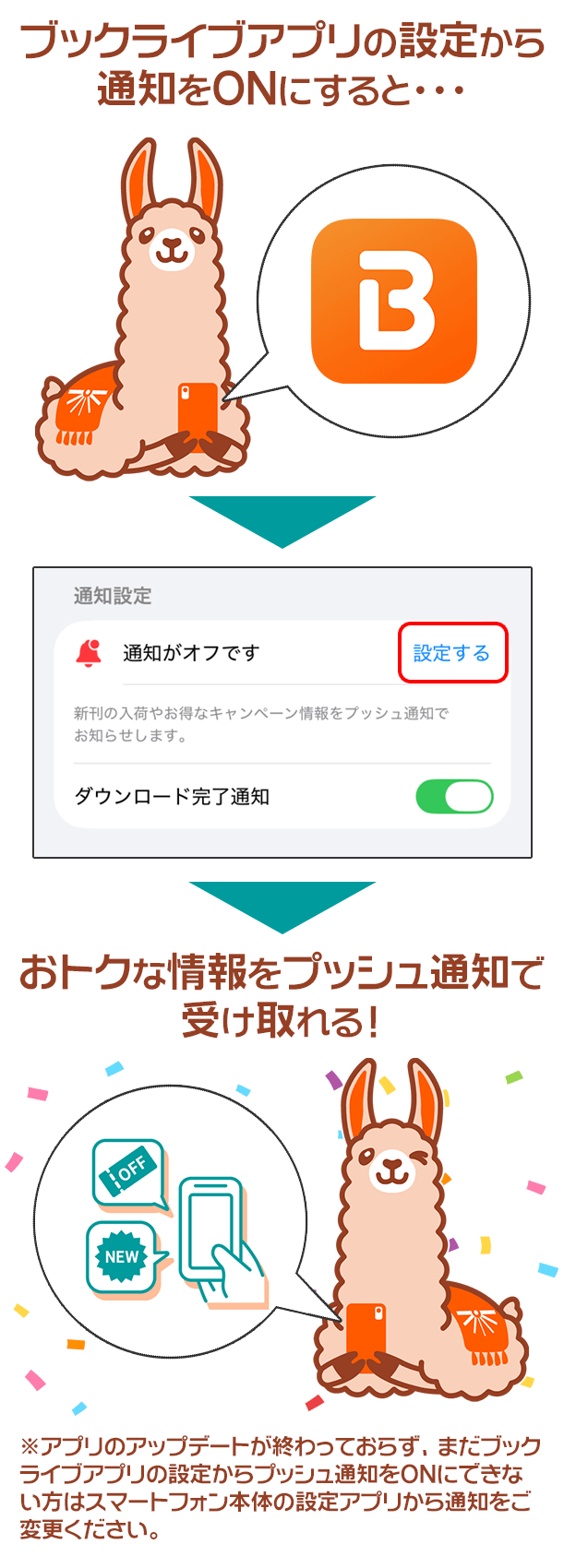 | キャンペーン参加方法 | 以下の操作を行うと、キャンペーンに参加できます。 ①期間中に本キャンペーンページの「エントリー」ボタンを押下する ②ブックライブアプリの設定からプッシュ通知を許可した状態にする ③設定変更後にアプリを以下の方法で再起動し、プッシュ通知を受け取れる状態にする ※①②の順番は不問です。 ■iOS ・アプリを一度終了してから再起動してください ■Android ・アプリを一度終了してから再起動してください その後、アプリ内のサブメニューから設定画面を開いてください ※GooglePlayストアで配信されているブックライブ for Androidアプリは最新版(バージョン1.1.5)にアップデートする必要があります。 |