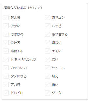 WEBからレビューを投稿する際、その作品にふさわしい気持ちを3つまで選んで投稿することができます。