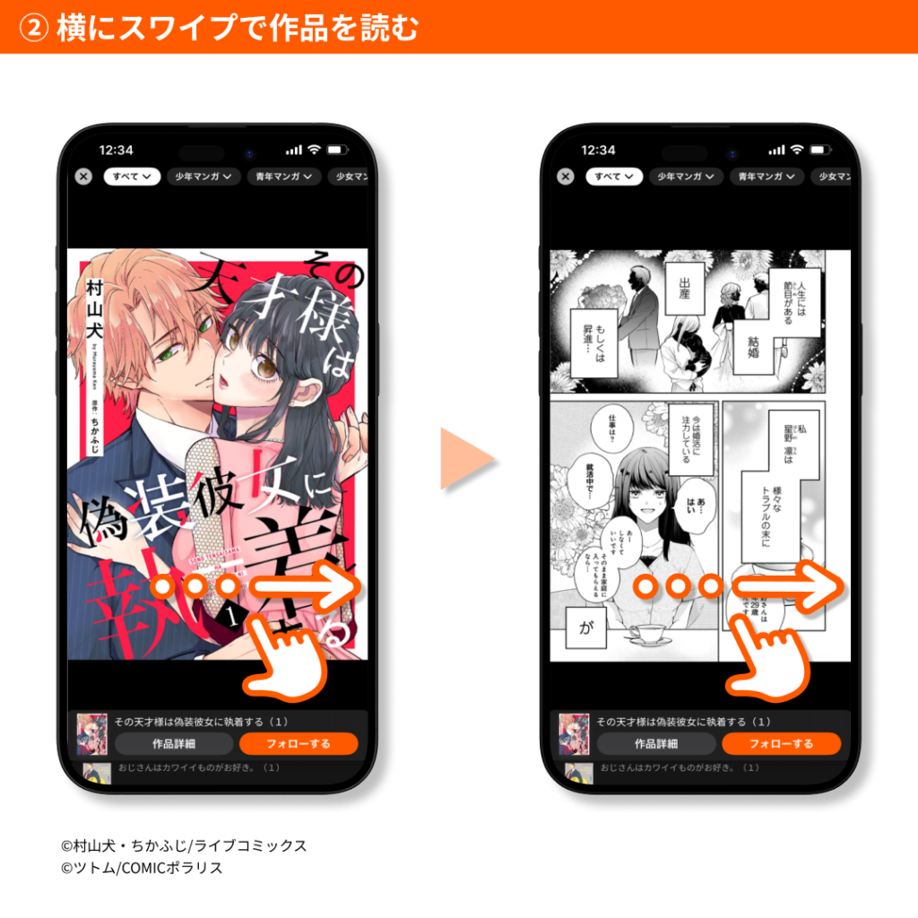縦にスワイプで次々と作品を発見、横にスワイプで気になる作品を試し読み。