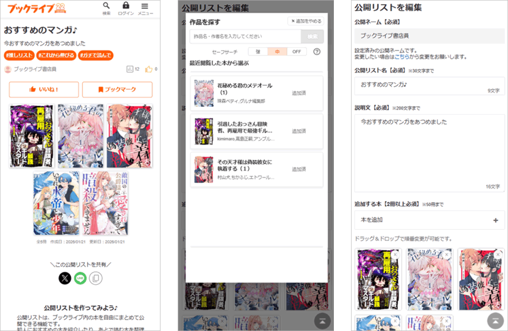 「公開リスト」はブックライブ内にある本の中から、好きな本を自由に組み合わせてリスト化し、家族や友人、SNSのフォロワーなどに公開・共有できる機能です。